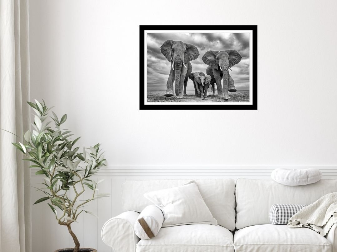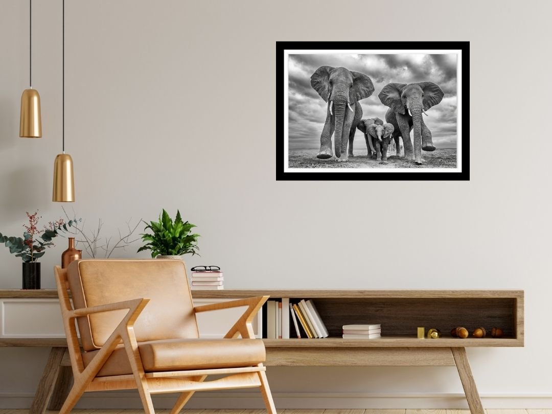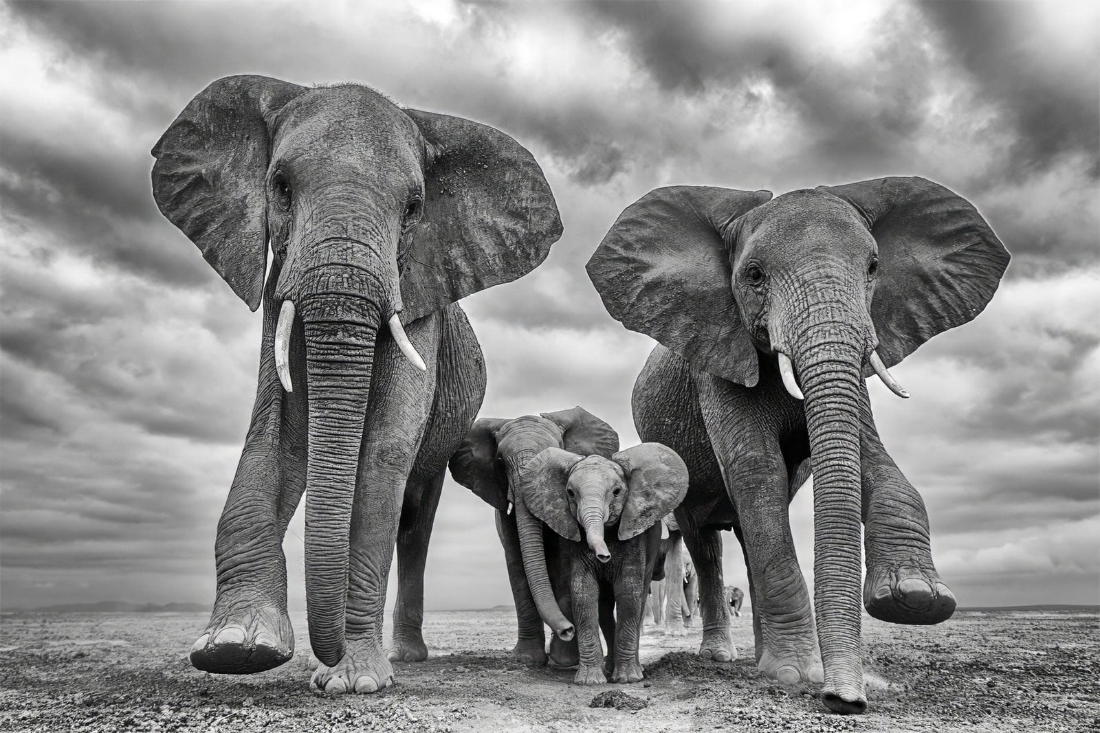 Beneath a vast canopy of dramatic, cloud-laden skies, a tiger prowls with measured grace. This fine art photograph captures the sheer majesty of the big cat in monochrome, emphasizing texture and contrast.