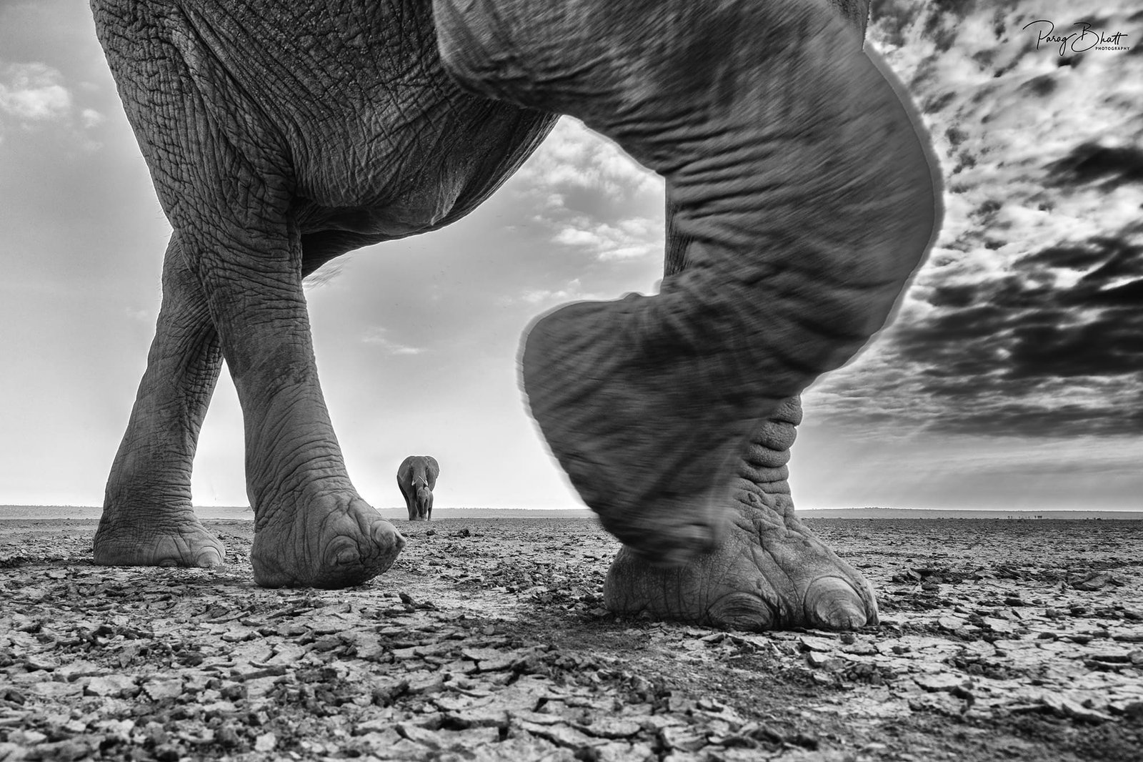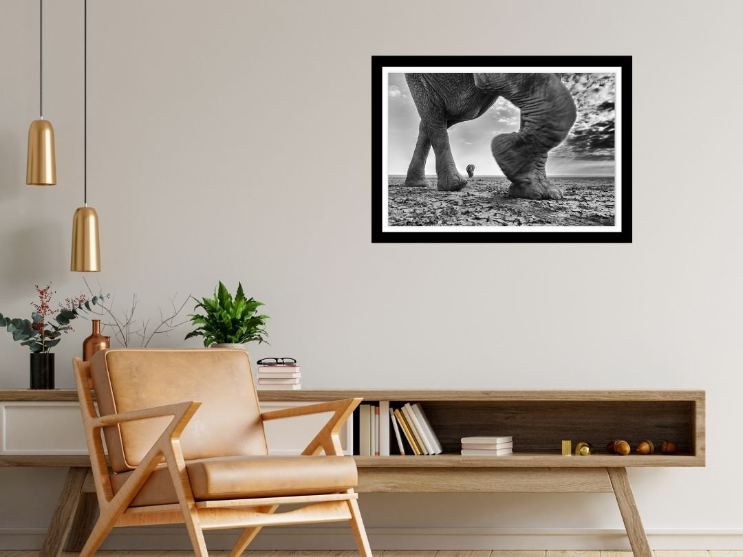 Beneath a vast canopy of dramatic, cloud-laden skies, a tiger prowls with measured grace. This fine art photograph captures the sheer majesty of the big cat in monochrome, emphasizing texture and contrast.