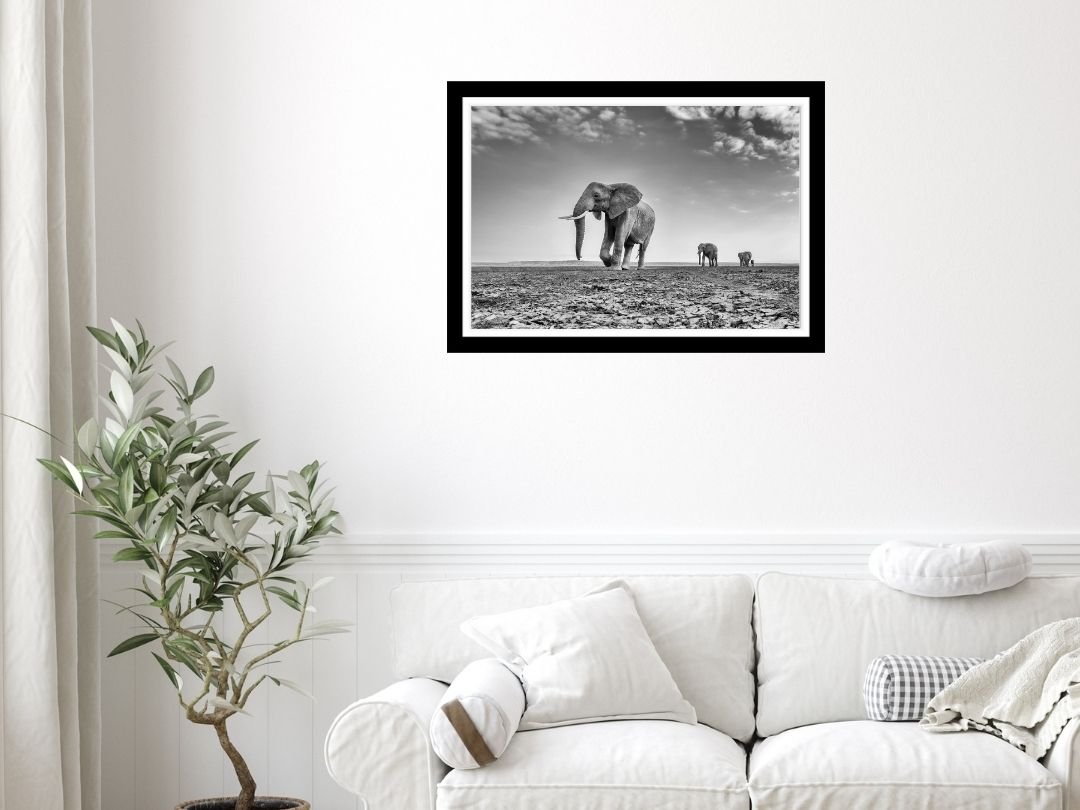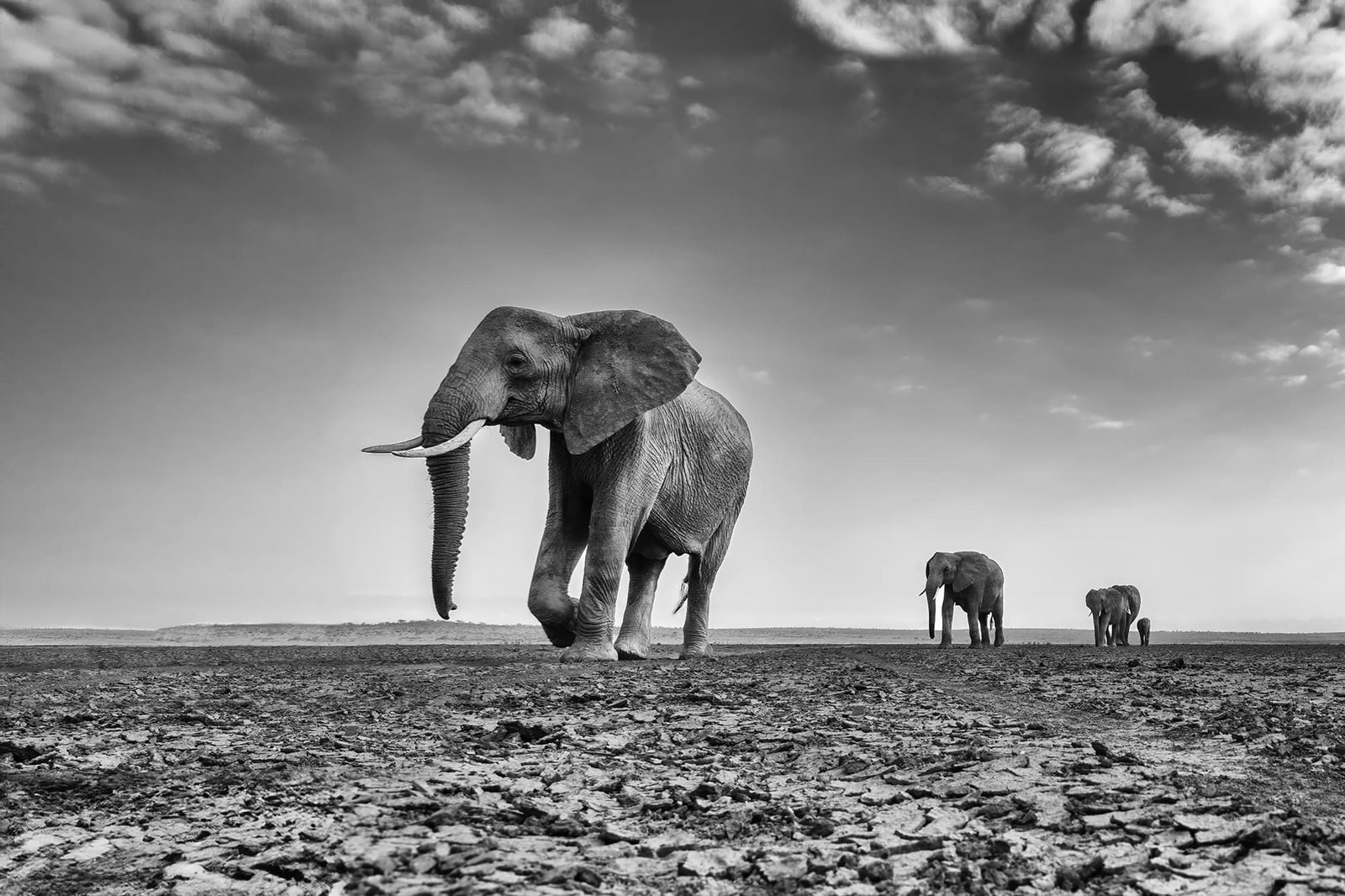 Beneath a vast canopy of dramatic, cloud-laden skies, a tiger prowls with measured grace. This fine art photograph captures the sheer majesty of the big cat in monochrome, emphasizing texture and contrast.