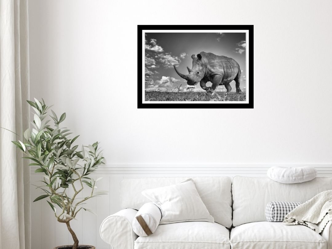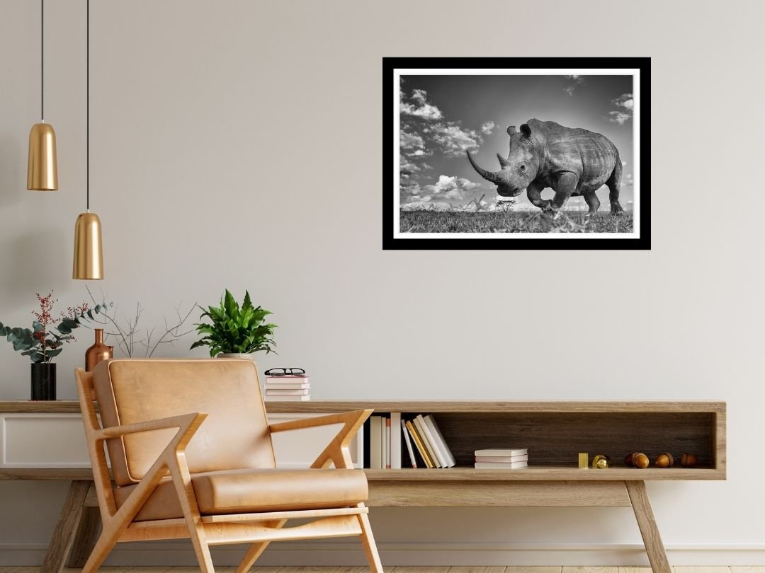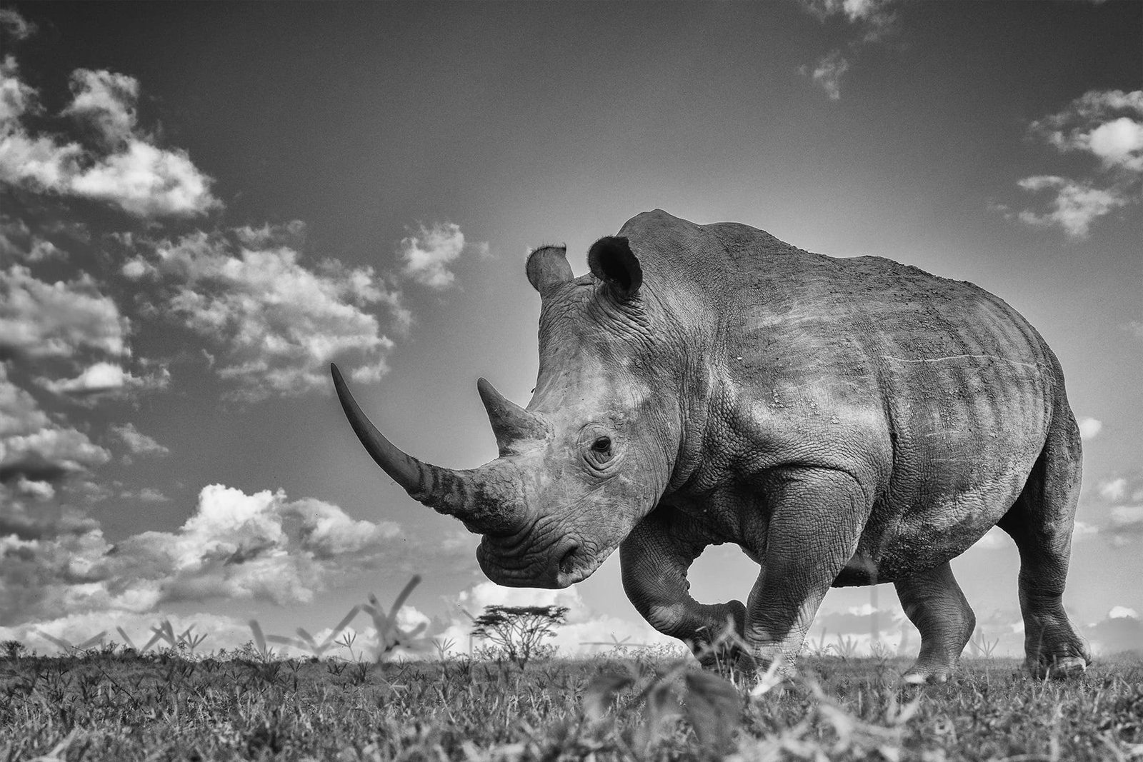 Beneath a vast canopy of dramatic, cloud-laden skies, a tiger prowls with measured grace. This fine art photograph captures the sheer majesty of the big cat in monochrome, emphasizing texture and contrast.