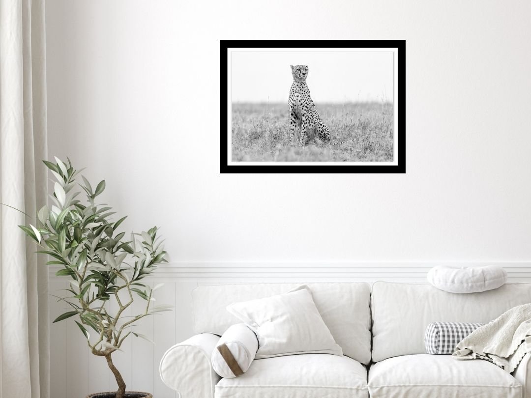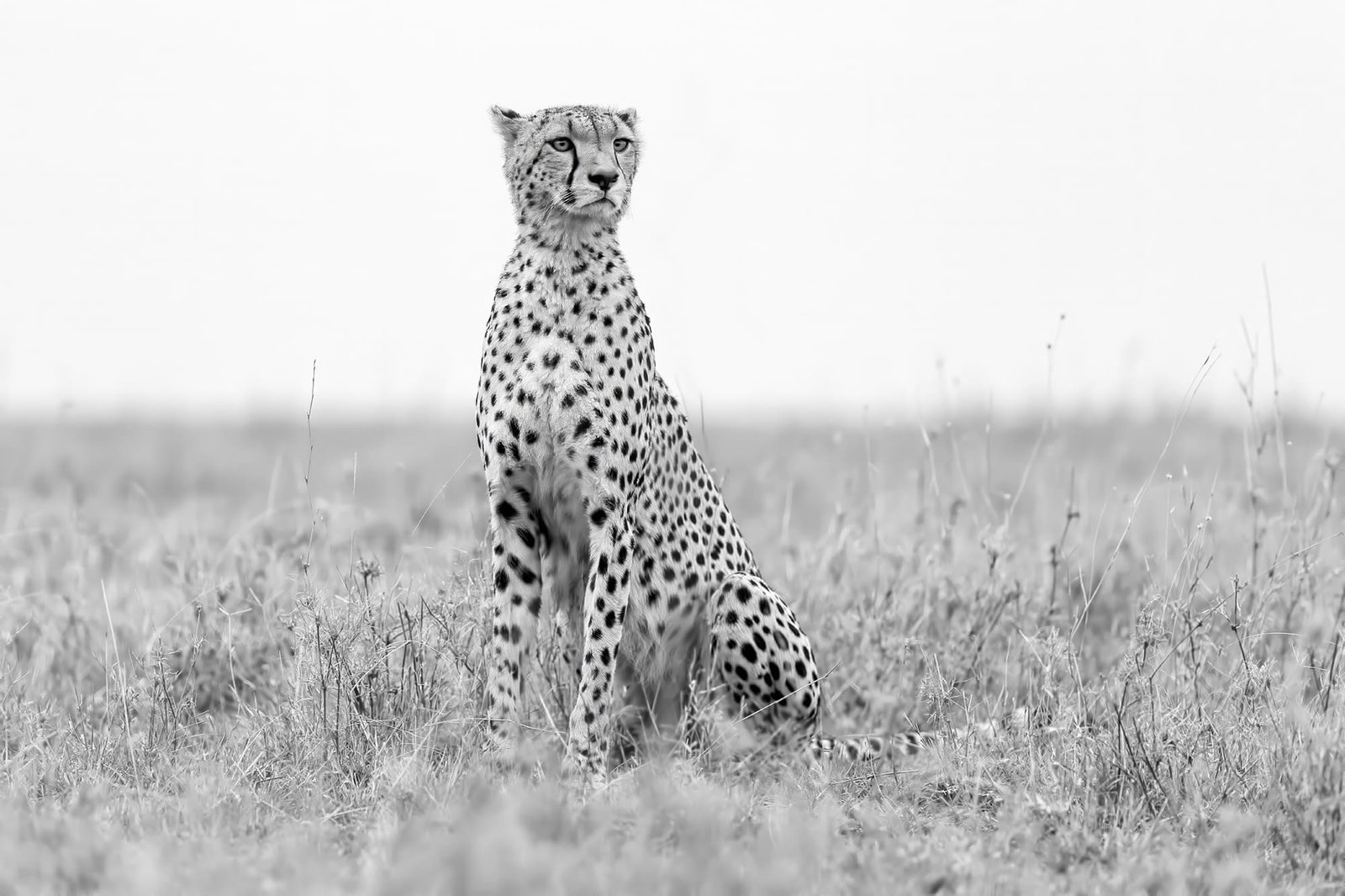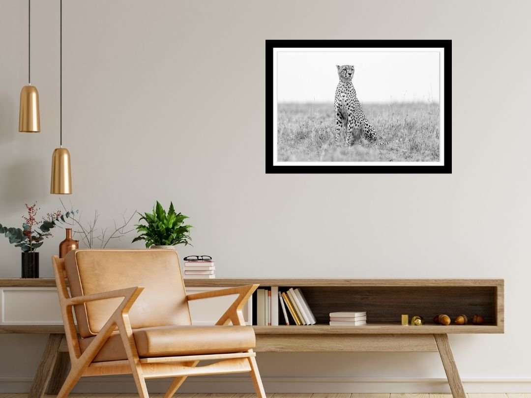 Beneath a vast canopy of dramatic, cloud-laden skies, a tiger prowls with measured grace. This fine art photograph captures the sheer majesty of the big cat in monochrome, emphasizing texture and contrast.