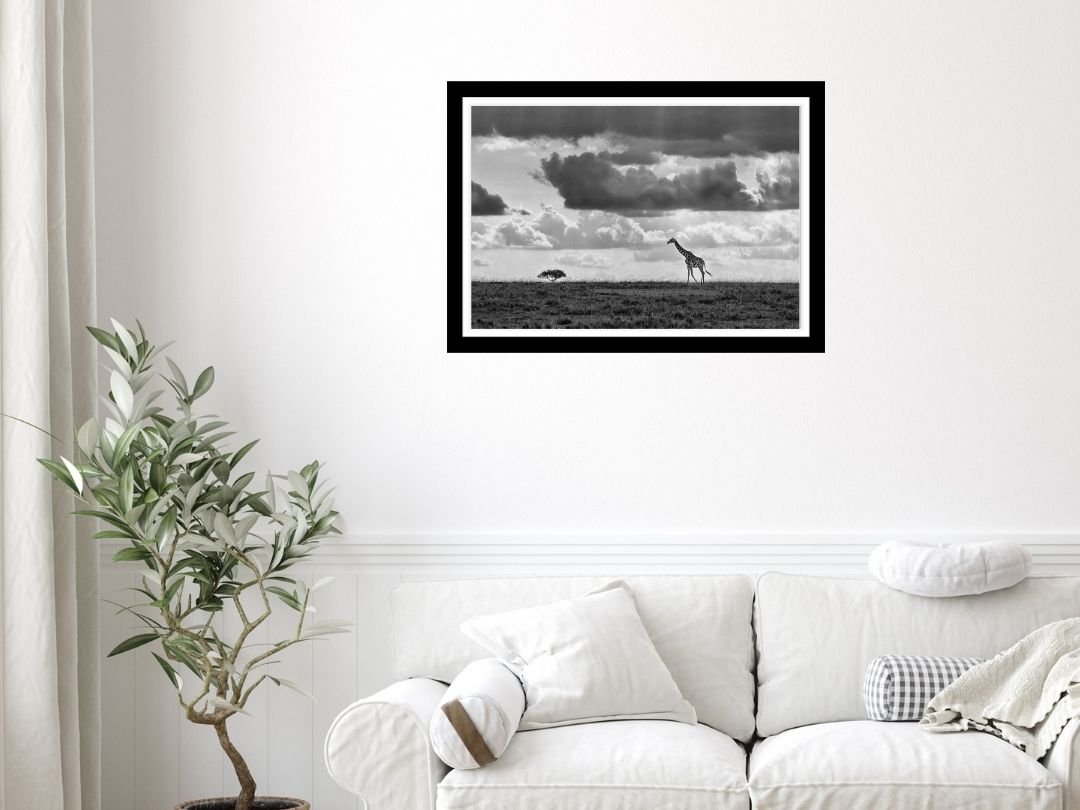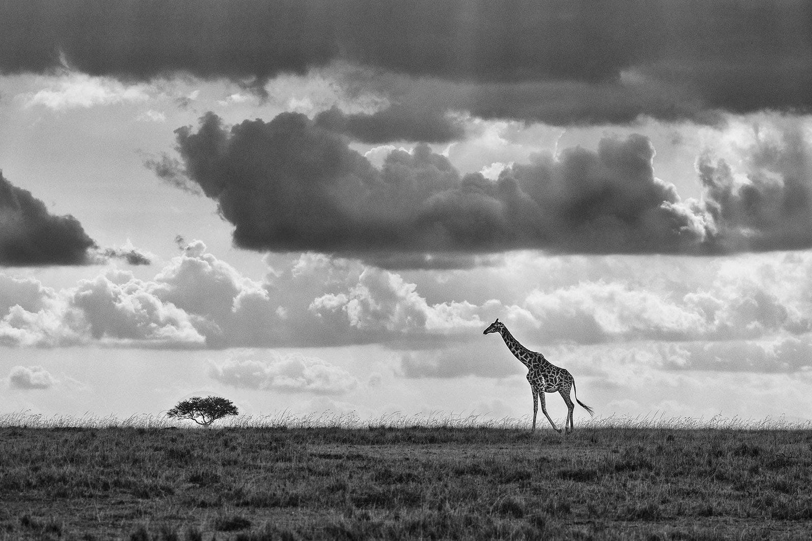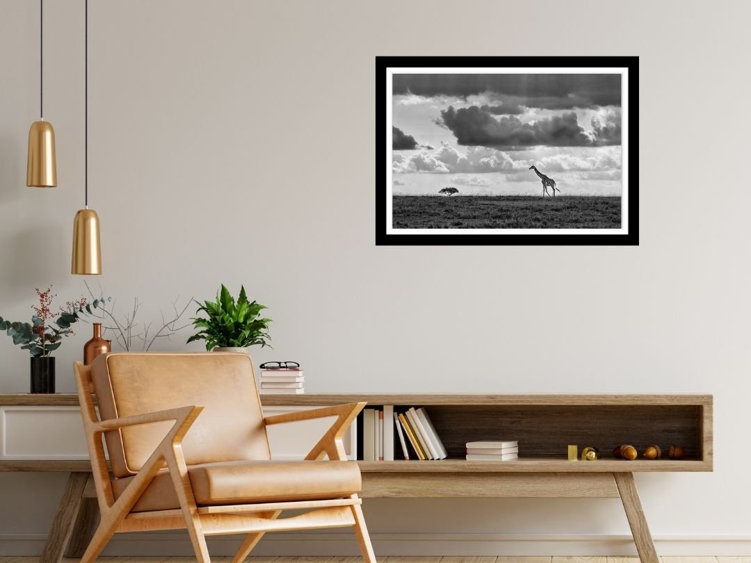 Beneath a vast canopy of dramatic, cloud-laden skies, a tiger prowls with measured grace. This fine art photograph captures the sheer majesty of the big cat in monochrome, emphasizing texture and contrast.
