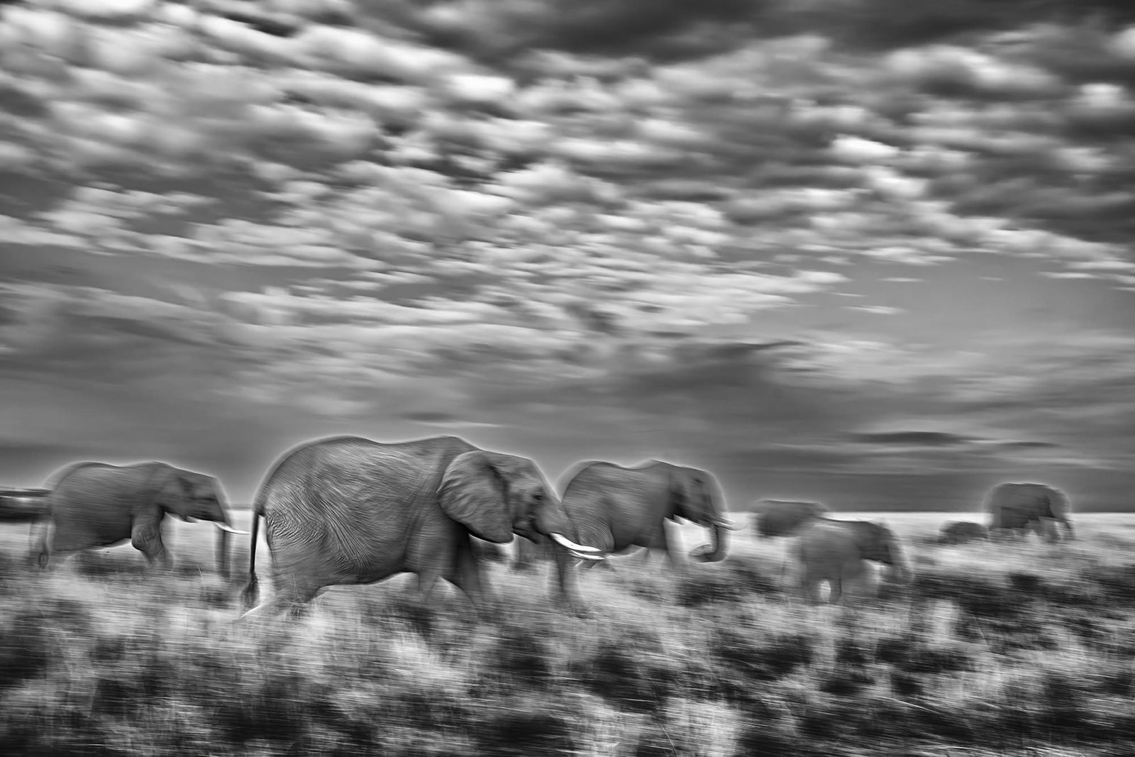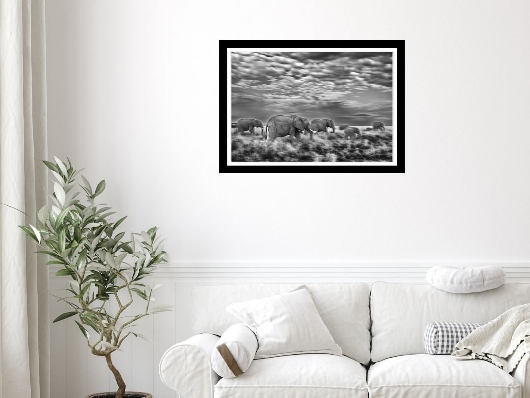 Beneath a vast canopy of dramatic, cloud-laden skies, a tiger prowls with measured grace. This fine art photograph captures the sheer majesty of the big cat in monochrome, emphasizing texture and contrast.