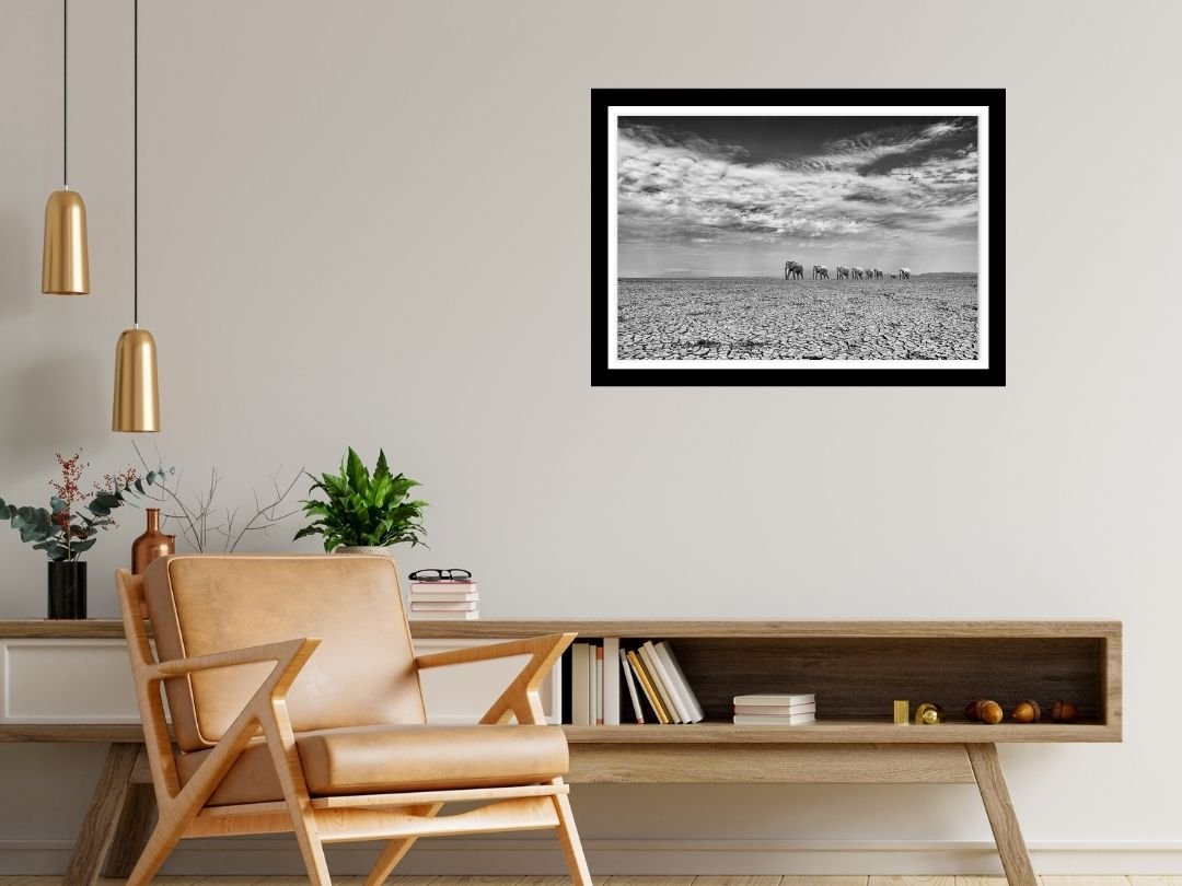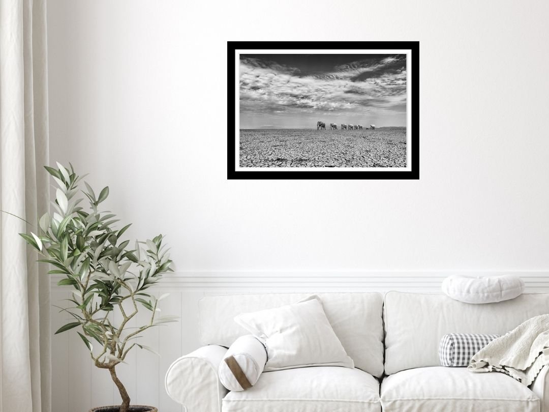 Beneath a vast canopy of dramatic, cloud-laden skies, a tiger prowls with measured grace. This fine art photograph captures the sheer majesty of the big cat in monochrome, emphasizing texture and contrast.
