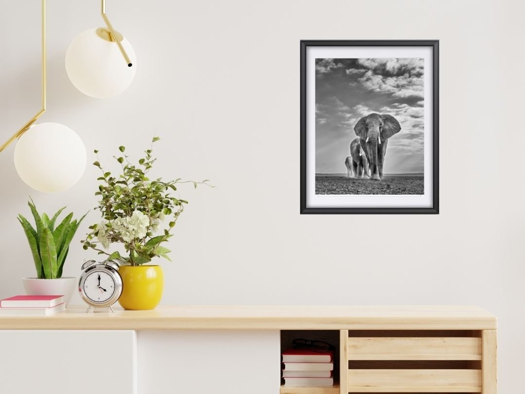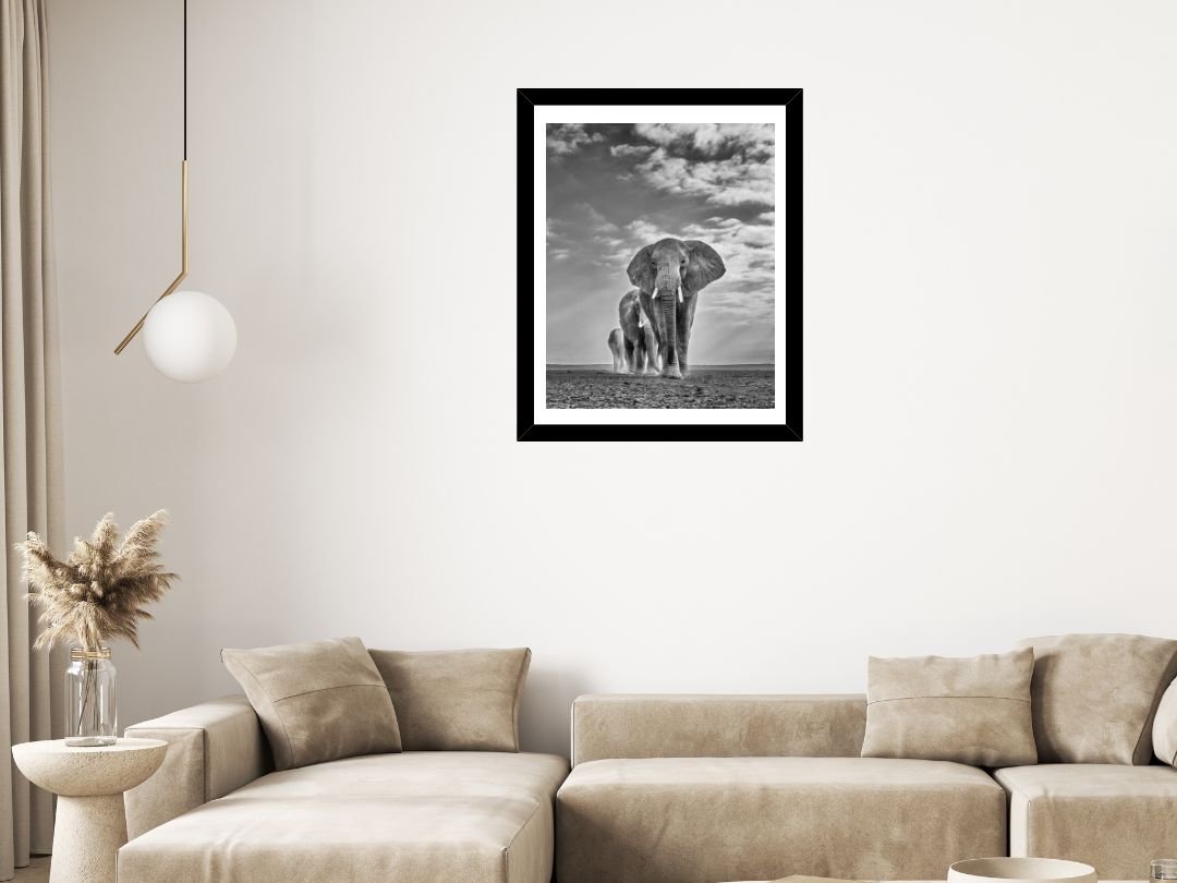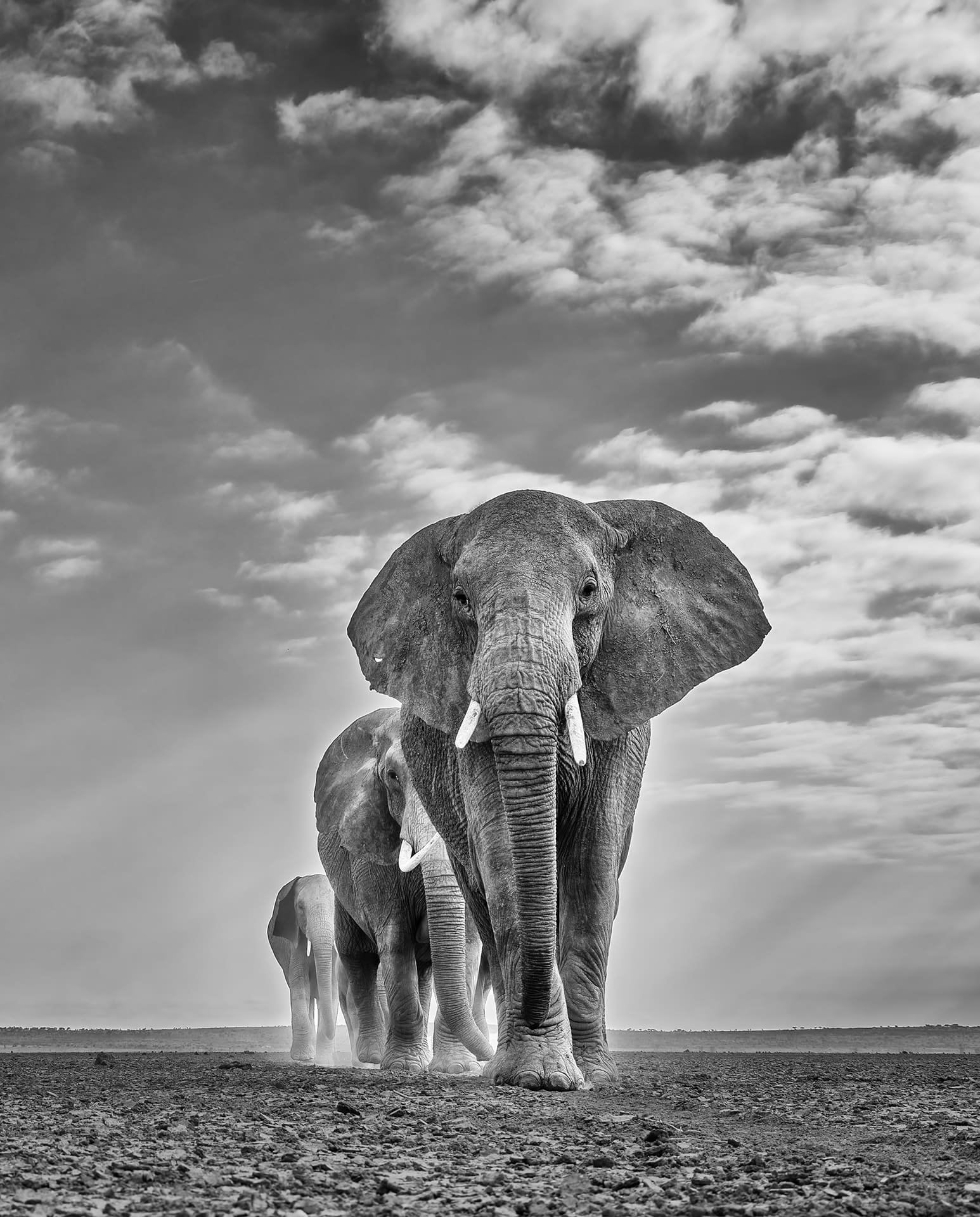 Beneath a vast canopy of dramatic, cloud-laden skies, a tiger prowls with measured grace. This fine art photograph captures the sheer majesty of the big cat in monochrome, emphasizing texture and contrast.