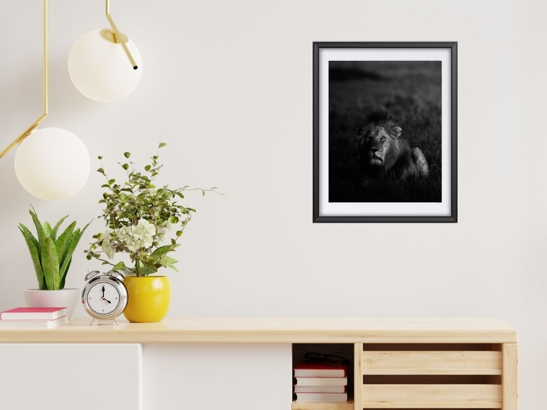 Beneath a vast canopy of dramatic, cloud-laden skies, a tiger prowls with measured grace. This fine art photograph captures the sheer majesty of the big cat in monochrome, emphasizing texture and contrast.
