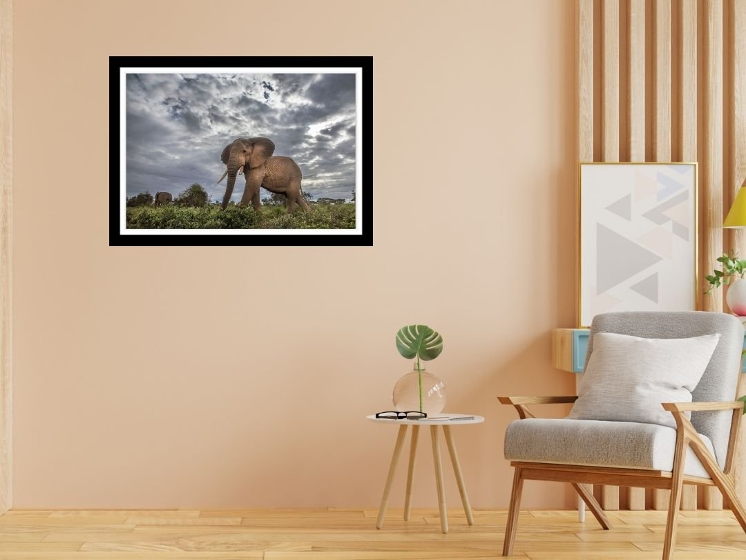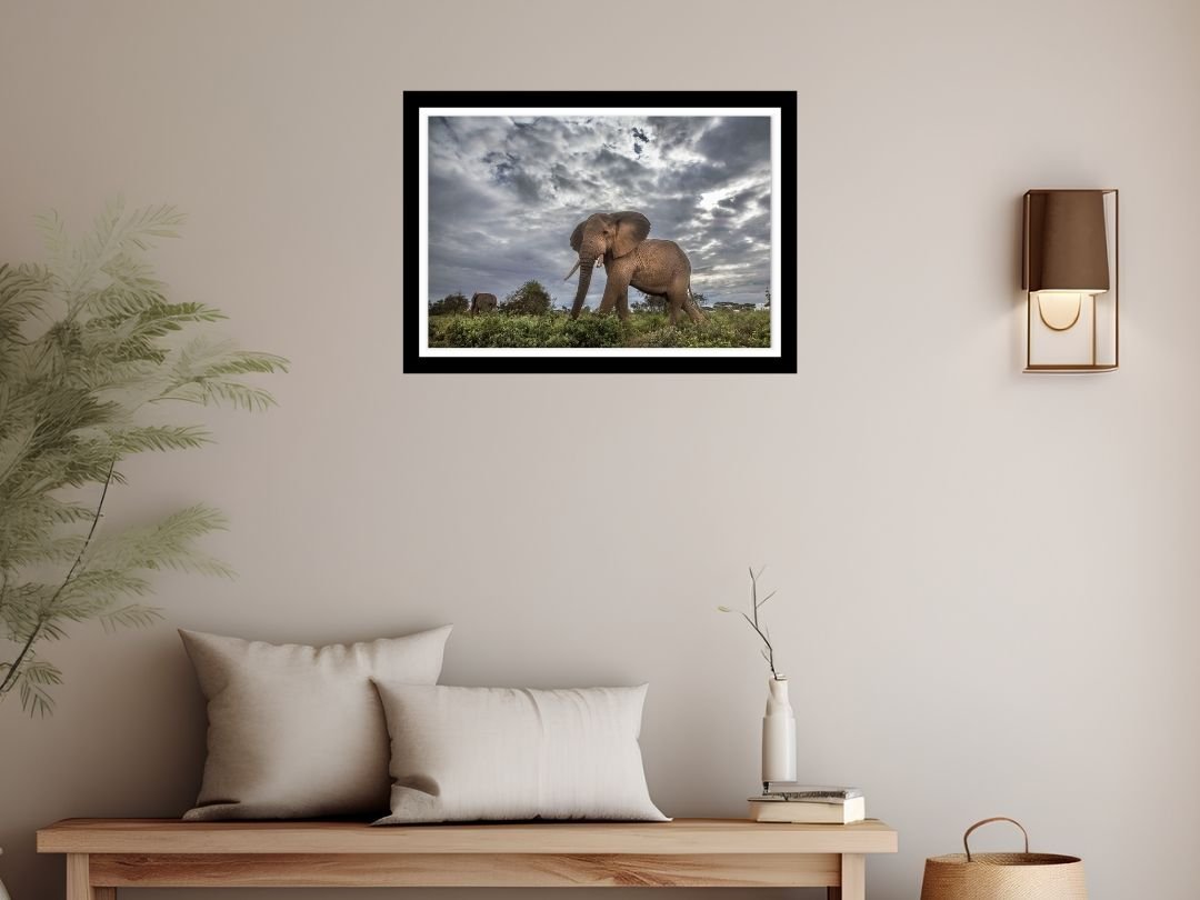 Beneath a vast canopy of dramatic, cloud-laden skies, a tiger prowls with measured grace. This fine art photograph captures the sheer majesty of the big cat in monochrome, emphasizing texture and contrast.